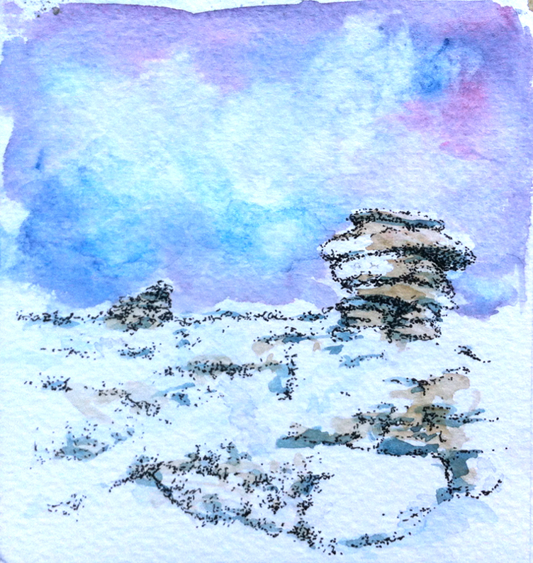 I start with West Penwith, I think it helps when you can see the snow has settled onto a hard surface and Lanyon Quoit, does the job quite well, with Ding Dong mine in the distance! I experimented with different colour blues for this, to see if it made a difference having a warm or cold palette, but I think both work.